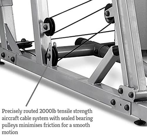 Installed at the rear and shrouded for safety is a 100kg solid vinyl weight stack, a weight identification guide clearly shows what each weight level equates too so you can easily monitor your progression in strength. In order to hoist the weight stack up and down high tensile 2000lb aircraft cables have been used that are guided through a series of pulleys, these have been fitted with bearings so the combination of the two ensures an ultra-smooth feel whilst your exercising, this is what makes all the difference.